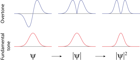 What does that mean? Say the wavefunction looks like depicted below. These are the two energetically lowest wavefunctions of a particle in a box, an easy model system. You can understand their shape when you think about a string of a guitar: When you play a note, the string vibrates in its fundamental tone. When you strike it harder you get a higher note, the first overtone. When we compute the probability to find the quantum mechanical particle, we observe that it does not depend on the relative sign of ψ. The wavefunction tells you where to find the particle in analogy to where the guitar string vibrates.