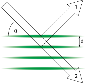 When you illuminate a crystalline sample with light of a single color, you observe bright stripes at certain angles. These depend on the wavelength of the light and the crystal you use. This technique, called Bragg diffraction, is a standard method to investigate matter. The idea is depicted in Fig. 1: A sample is illuminated under an angle θ and the light is reflected at each atom (blue and red dots). As shown, this happens not only at the outermost layer but also at layers deeper inside the crystal. From the sketch it is also apparent that the lower part of the beam has to travel longer to reach the detector further to the right. The path difference is drawn in a broken line and amounts to 2 d×sin(θ).