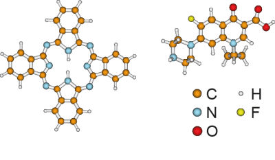 The molecules used to investigate molecular Bragg diffraction: The dye molecule phthalocyanine on the left and the antibiotic ciprofloxacin on the right.