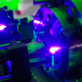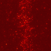 The video shows how molecules reach the detector in an actual experiment. The organic dye molecules phthalocyanine is diffracted at a nanomechanical grating and each of them corresponds to a red glowing point as it emits light. As more and more molecules are accumulated, the distinct diffraction orders becomes clearly visible – the zeroth diffraction order in the middle, the + and – first orders next to it, and to on.