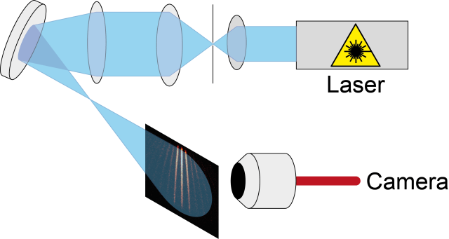 The detector is in our case a 170 µm thin quartz plate at the end of the vacuum chamber. Here the molecules stick as soon as they land. In order to visualize the pattern the molecules are forming, we excited them electronically with laser light of a suitable color. The molecules absorb the light and re-emit it in the form of fluorescence photons. The re-emitted light is collected with a microscope objective and guided to a camera.