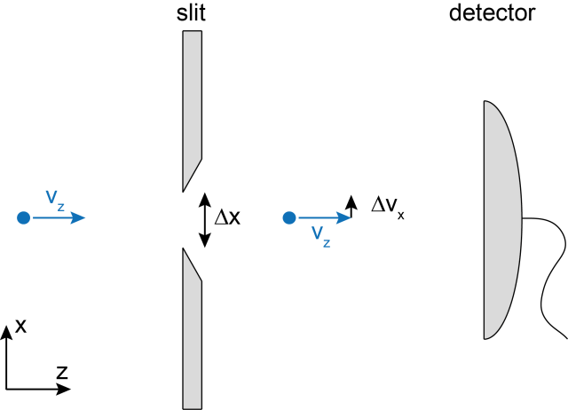 In this experiment, we consider helium atoms, let them fly through a slit, and detect the size of the resulting stripe 1 m behind the slit at a detector. The width of the slit measures the position of the atoms in the x-direction, as the atoms have to pass it to reach the detector. According to Heisenberg, this measurement induces a change in the velocity along the axis we measure, x. To simplify things, we start with atoms that move only along the z-direction with 500 m/s, but not at all along x. As soon as the measurement has an effect on the molecules, they will also start to move in the x-direction and the signal at the detector will be wider than the slit.