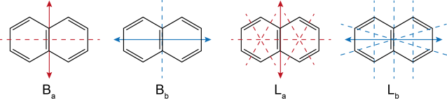 Except for highly symmetrical molecules like benzene, the degeneracy in the energy of the states is lifted. The resulting sub-levels are denoted a and b, depending on the orientation of the new nodal plane introduced into the electronic wave function. For the a state, the nodal planes are situated in such a manner, that the electron density is located at the atoms, while the effective charges go to the bonds for the b state. This is illustrated in Figure 3 for the states of naphthalene. According to the third of Hund’s rules, the L states are energetically always lower than the B states.