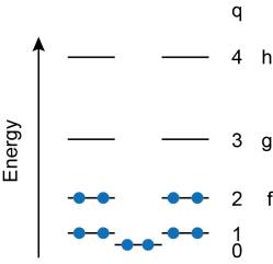 electrons. The first unoccupied shell is g, the second unoccupied shell h, and so on.