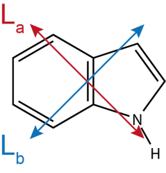 As the molecular symmetry of indole is much lower than the one of benzene, the energetic degeneracy is lifted and we get two separated transitions. In the gas phase, the difference between both states amounts to 2000 cm-1, which is around 5% of the total transition energy. The transition dipole moments of the two states are perpendicular to each other like in the case of naphthalene, shown in Figure 4.