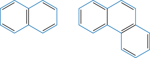 Figure 1: The two cata-condensed hydrocarbons naphthalene (left) and phenanthrene (right). The perimeter determining l is drawn in blue.